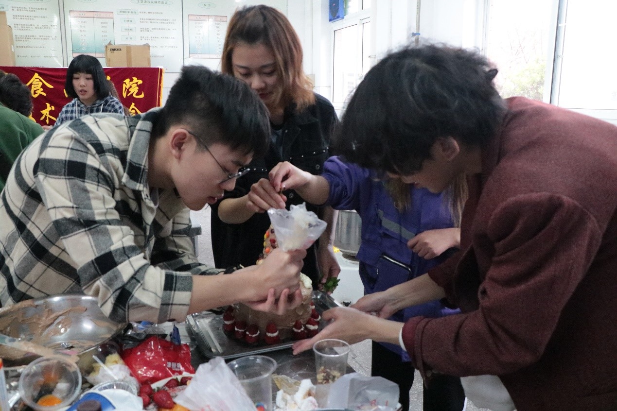 下午18:00,八组同学的蛋糕作品全部完成,吕远平教授和烘焙工艺技术开发协会评审团开始根据作品的创新、主题吻合度、营养、风味给作品打分。吕远平老师和各组参赛选手亲切交谈,听取各组选手对各自作品的主题描述、设计理念阐述、产品寓意说明,并对产品的原料选择和制作方法对各组参赛选手进行了解询问。