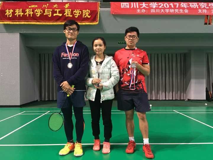 2017年11月25日—12月3日,四川大学2017研究生阳光体育羽毛球联赛在望江校区风雨羽毛球场顺利举行。我院研究生羽毛球队以团体总成绩第一喜获佳绩,获得本次团体冠军,其中我院混双组合叶勤文和文嘉婷同学夺得第二名优异成绩,男单贾欣驹同学夺得第二名优异成绩,邓莎老师进入教师组前八名。