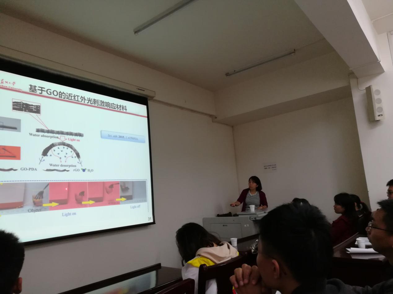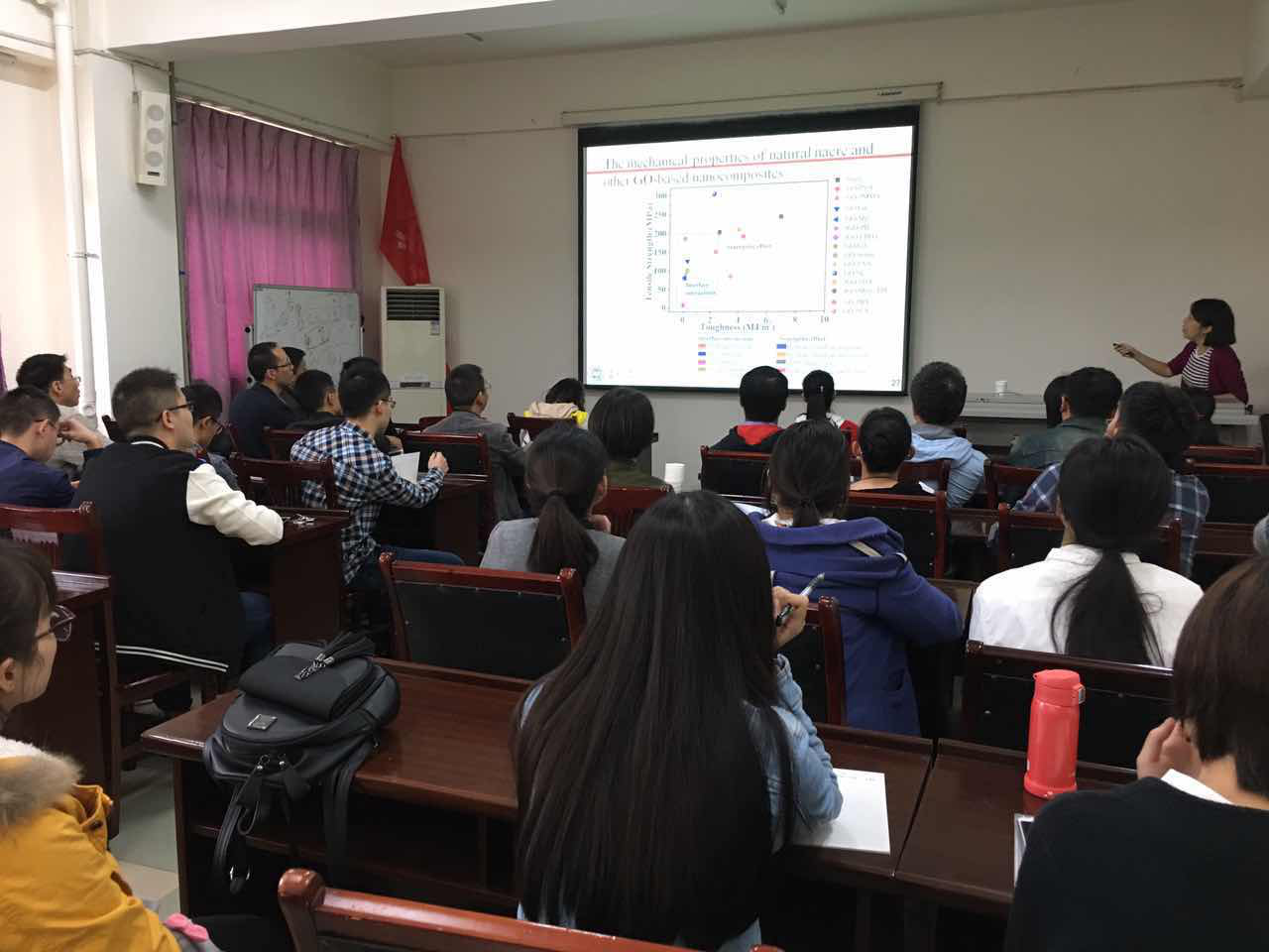 杨晓明副教授本科、硕士毕业于四川大学,在南京大学获高分子化学与物理博士学位,并先后在香港理工大学和宾夕法尼亚大学从事博士后研究和担任访问学者,她的研究兴趣在于石墨烯/高分子功能材料和具有微/纳结构的导电高分子等领域。杨晓明副教授从石墨烯的历史、石墨烯复合物结构的设计及应用等方面开展讲座,报告了她在氧化石墨烯/聚合物层状结构材料的设计、制备及其近红外光响应研究的最新研究结果。杨晓明老师的报告幽默风趣,内容深入浅出,激起了在座老师和学生的浓厚兴趣。讲座期间,师生踊跃发言提问,通过与杨晓明老师面对面的交流,拓宽了我院师生的研究视野。