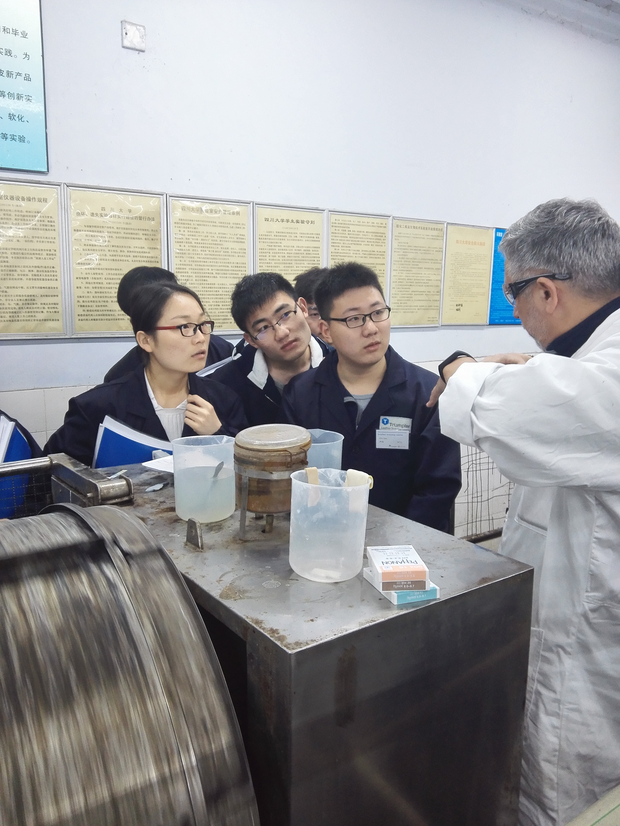 陕西科技大学轻工技术与工程学院皮革系副系主任许伟博士、嘉兴学院材料与纺织工程学院轻化工程系主任罗建勋副教授、齐鲁工业大学皮革化学与工程学院教师王玉路博士、齐齐哈尔大学轻工与纺织学院副院长宋秘钊教授等,四川大学威廉williamhill体育院长何有节教授、党委副书记刘晓虎副教授、生物质与皮革工程系主管本科教学副系主任彭必雨教授、主管研究生和科研副系主任林炜教授、主管行政副系主任张宗才教授,学院本科生和研究生辅导员李晓秀、冯国涛、苏德强以及相关专业的教师等参加了开班仪式。开班仪式由川大威廉williamhill体育生物质与皮革工程系轻化工程及生物工程本科生实验室主任陈慧副教授主持,何有节院长致辞。参加本次培训班的五所高校轻化工程专业全体学员、四川大学2014级轻化工程专业和2015级成教轻化工程专业(皮革工程方向)的全体同学参加了本次开班仪式和公开讲座。 本期“汤普勒—四川大学制革技术培训班”是为了提高我国轻化工程专业(皮革工程方向)学生的工程实践能力,增进中国开设轻化工程专业(皮革工程方向)各高校同学和教师的交流,培养与国际市场接轨的制革专业技术人才而举办的。培训班采用课堂教授与实践相结合的方式,讲授牛皮鞋面革和羊皮服装革的试制技术,由汤普勒(Trumpler)集团产品交流和推广经理Dr.Jeffry Guthrie-Strachan(国际皮革工艺师和化学家协会联合会(IULTCS)IUT培训委员会主席)及汤普勒公司其他工程技术人员担任培训主讲,并具体指导学生现场实验和操作。