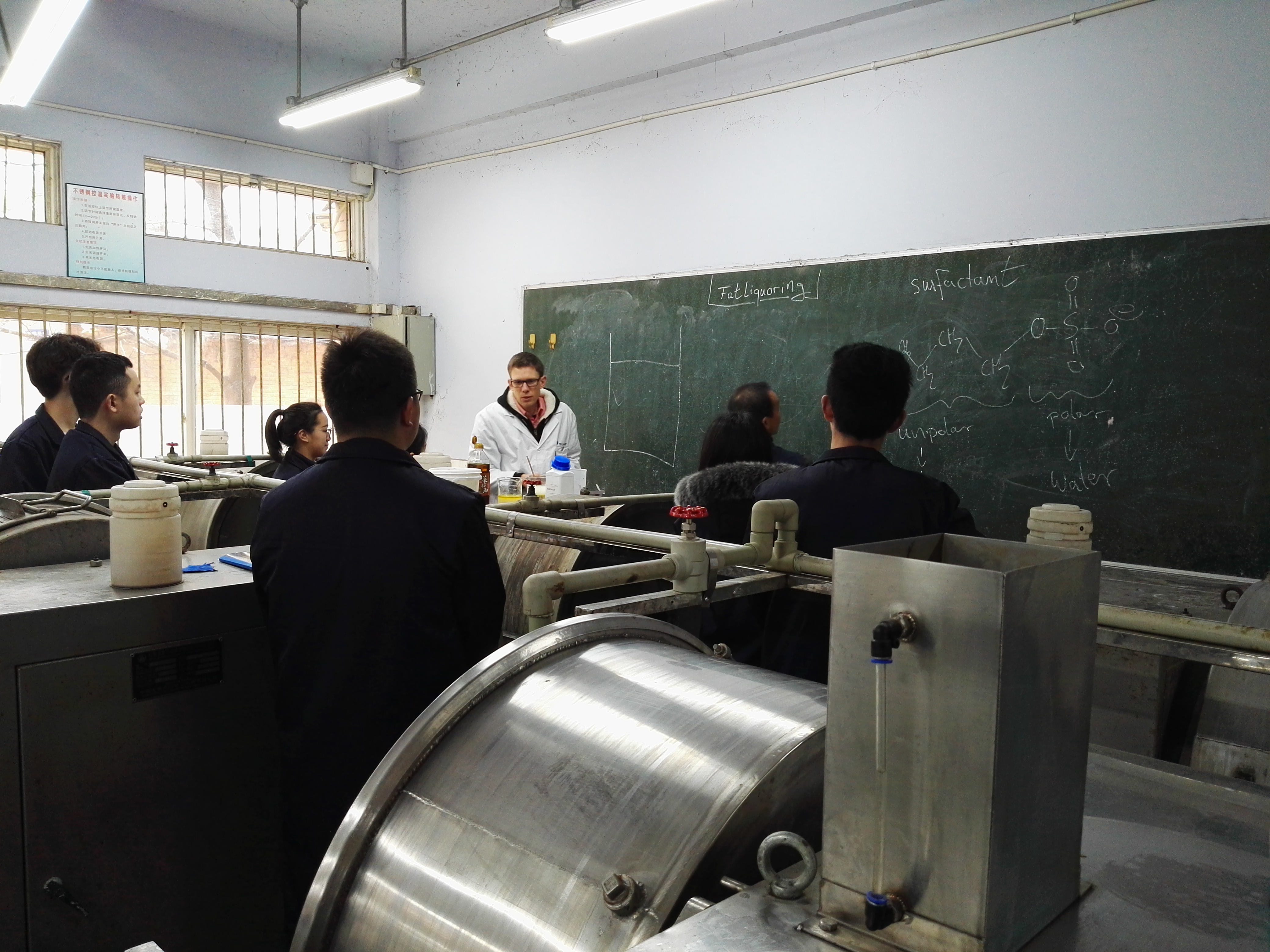 本期“汤普勒—四川大学制革技术培训班”历时7天,培训内容从原料皮到成革的涂饰,培训方式为理论授课和现场实践相结合。培训期间,汤普勒德国产品交流和推广经理Dr.Jeffry Guthrie-Strachan,汤普勒西班牙研发专家Miss Laura以及汤普勒德国研发专家Dr.Benjamin Autenrieth分别给学生们讲解制革相关工序(前处理,复鞣,染色加脂以及涂饰工段)工作原理以及材料结合机理。在培训制革工序的实际操作流程中穿插理论讲授,通过幻灯片演示,现场作图或直接示范等一系列配合,帮助学员们快速的理解和掌握要点。整个过程中,汤普勒团队配合现场教师团队,实现了一次以交流和分享为主旨的别具一格的培训。