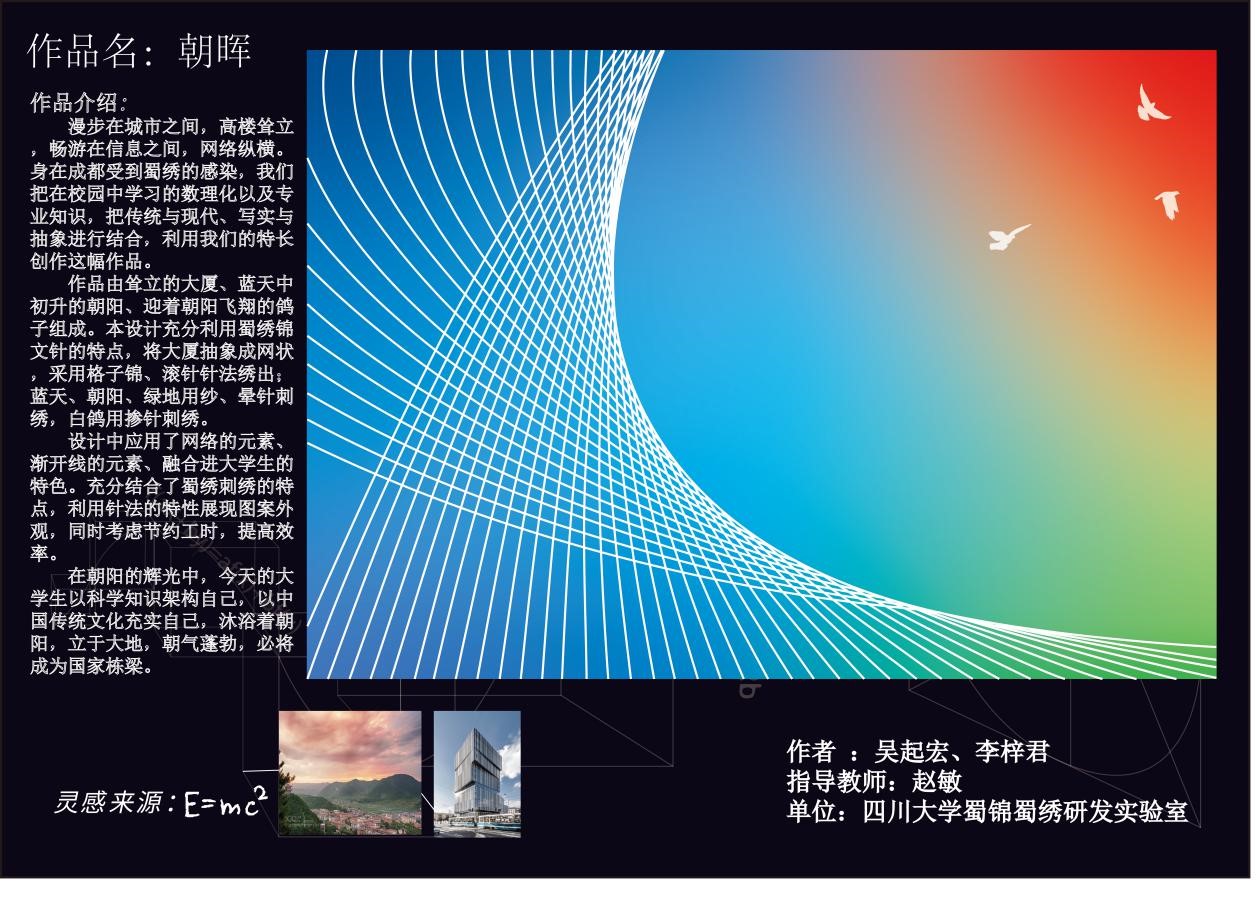10月18日,在一片秋雨朦胧中,由四川省妇女联合会指导、成都市妇女联合会主办的全国“大众创业万众创新”活动周系列活动——第五届蜀绣创意大赛暨颁奖典礼于成都大邑县幸福公社落下帷幕,我院蜀绣蜀锦设计研发课题组参赛师生与蜀绣大师和蜀绣参赛企业们同台竞争,由赵敏、吴起宏、李梓君、王维杰设计的蜀绣装饰画稿“朝晖”、蜀绣包包“新·生”分别获得了银奖和铜奖。
