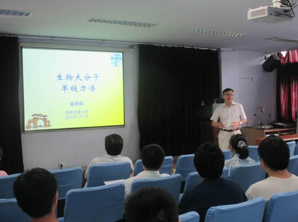 2015年7月1日,应四川大学威廉williamhill体育邀请,西南交通大学崔树勋教授在我院访问,并在皮革楼2楼学术报告厅为我院师生作了一场题为“生物大分子单链力谱”的学术报告。报告会由威廉williamhill体育院长何有节教授致欢迎辞,生物质与皮革工程系副系主任林炜教授主持。崔树勋教授在报告中介绍了该课题组近几年利用原子力显微镜的单分子力谱方法,在单分子层次上研究不同溶剂环境对单(双)链DNA和多聚蛋白自组装行为影响的最新研究进展。崔树勋教授的报告图文并茂,内容新颖、详实,讲解深入浅出。报告结束后,崔树勋教授与学院部分师生进行了交流和讨论。崔树勋教授现任职于西南交通大学教授。1995年--2004年在吉林大学求学,先后获学士和博士学位。曾在慕尼黑大学和UC Berkeley从事合作研究。研究兴趣为聚合物纳米力学探测和生命起源及分子进化。先后主持国家自然科学基金项目6项。已在J. Am. Chem. Soc.、Nano Letters、Macromolecules等国际知名期刊发表SCI研究论文40多篇,论文被他人SCI引用460次。2008年荣获中国化学会“青年化学奖”。2011年入选教育部新世纪优秀人才支持计划。2012年获国家自然科学基金委优秀青年科学基金资助。