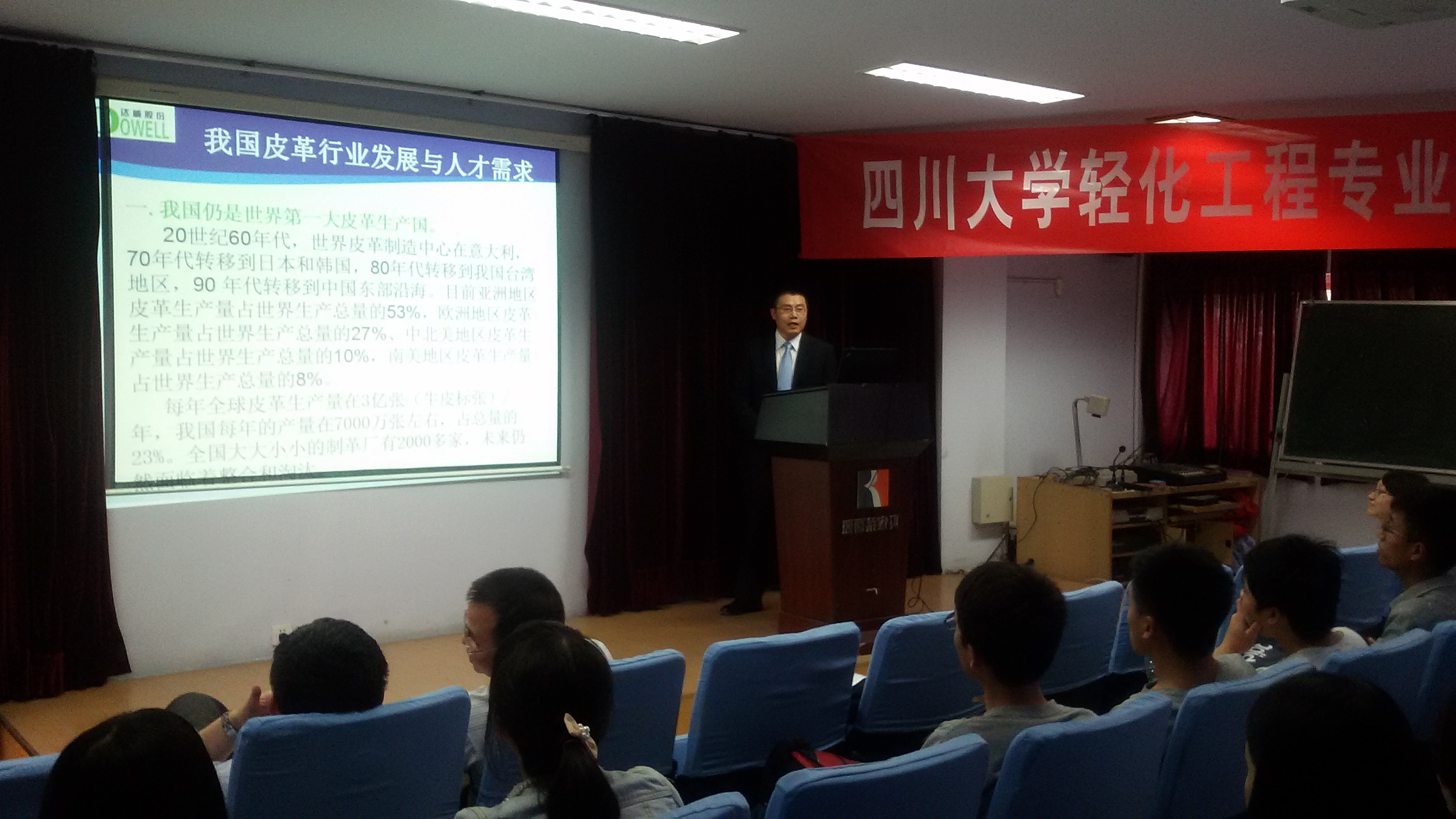 曾晓林副总经理讲座的题目是“我国皮革行业发展与人才需求”,介绍了我国皮革行业的发展现状、产业集中发展的趋势、国家对环保的要求、国产皮化行业快速发展的历程以及对高端专业人才的需求等情况。曾总和何有节院长还介绍了四川大学与四川达威科技股份有限公司共建国家级工程实践教育中心接受学生实习、培养学生的情况,以及达威公司与川大就学生实践教学、工程能力培养等方面开展的工作。