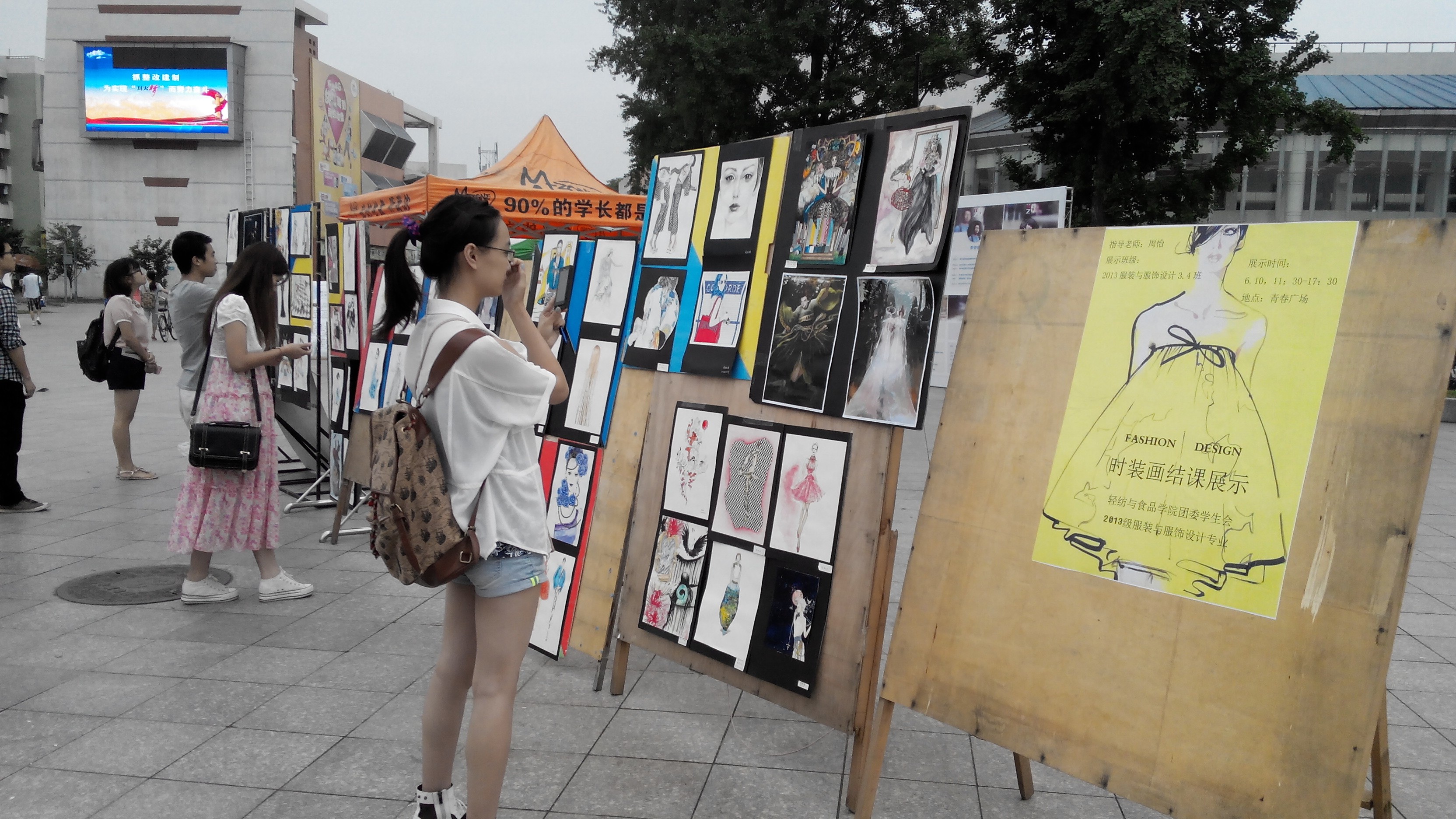 2014年6月10日-12日, 我院专业课程《时装画技法》结束之际,在我院周怡副教授的发起和指导下,2013级服装与服饰设计专业的同学在江安校区青春广场开展了“时装画结课展示”活动。通过这次展示活动,同学们以实践来切身学习服装展示设计,使他们时装画技法展示的技能得到很大的提高。更重要的是,这次活动采取了让全校师生参与投票、填写意见等方式与服装专业的同学在学术上有了一定的交流,使他们对服装设计专业有了更具体的了解。我院2013级服装与服饰设计的同学积极响应 “时装画结课展示”活动的号召,共有76名学生参与了此次活动。由指导老师周怡选派优秀作品者参与展览,优秀参展作品高达150多张。通过这次活动,同学们用自己的实际行动和作品给全校师生带来了一场艺术上的视觉享受。