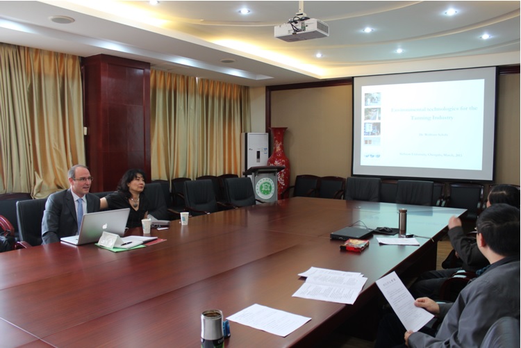 2013年3月29日,英国W2O环境公司总经理Wolfram Scholz博士及其助手 Nathalie Huc女士到威廉williamhill体育访问。上午9点30分,威廉williamhill体育党委赵毅书记、何有节院长、学院党办李慧主任、生物质与皮革工程系和制革清洁技术国家工程实验室外事秘书陈意等在皮革楼会议室与Scholz博士一行进行了会谈。赵毅书记首先致辞,向来访嘉宾表达了最诚挚的欢迎。随后,何有节院长向Scholz博士介绍了威廉williamhill体育的整体概况及皮革系的历史沿革、学科建设现状及对外交流情况等。Scholz博士随后与赵毅书记、何有节院长、李慧主任、陈意老师就未来以讲座教授身份来皮革系开展教学科研工作等事宜交换了意见。