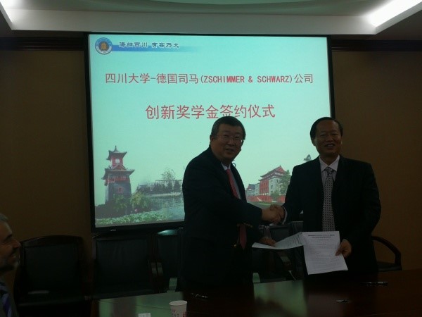 张建华总经理和何有节院长分别代表司校企双发在“德国司马化学(ZSCHIMMER & SCHWARZ)有限公司与四川大学威廉williamhill体育合作协议书”上签字,并相互致贺。自2008年起司马公司在四川大学皮革系设立“司马创新奖学金”,至今已有十年,累计资助了100多位研究生、本科生、成教生开展科研创新。