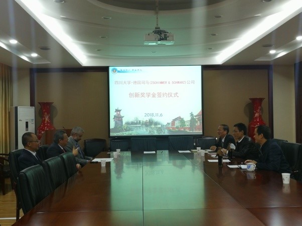 2018年11月6日,司马公司与我院续签“司马创新奖学金”仪式在皮革楼209会议室隆重举行。德国司马化学公司(ZSCHIMMER & SCHMWARZ)研发部经理Francke博士、司马化学公司首席代表/皮革部中国区张建华总经理、皮革部技术代表滑洪臣工程师,学院冯国涛副书记、皮革系副系主任程海明教授和皮革工程教研室主任但年华副教授等出席了签字仪式。