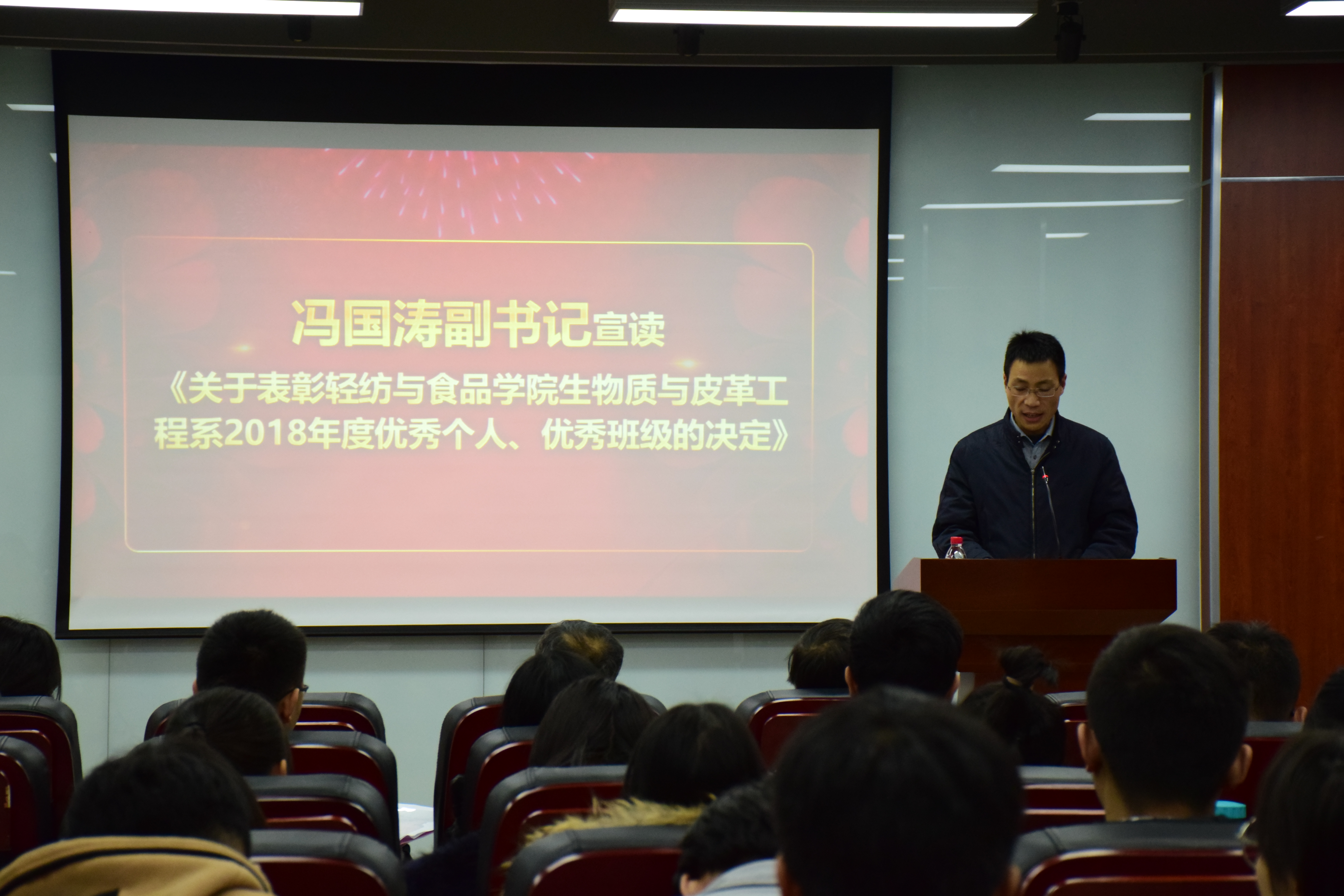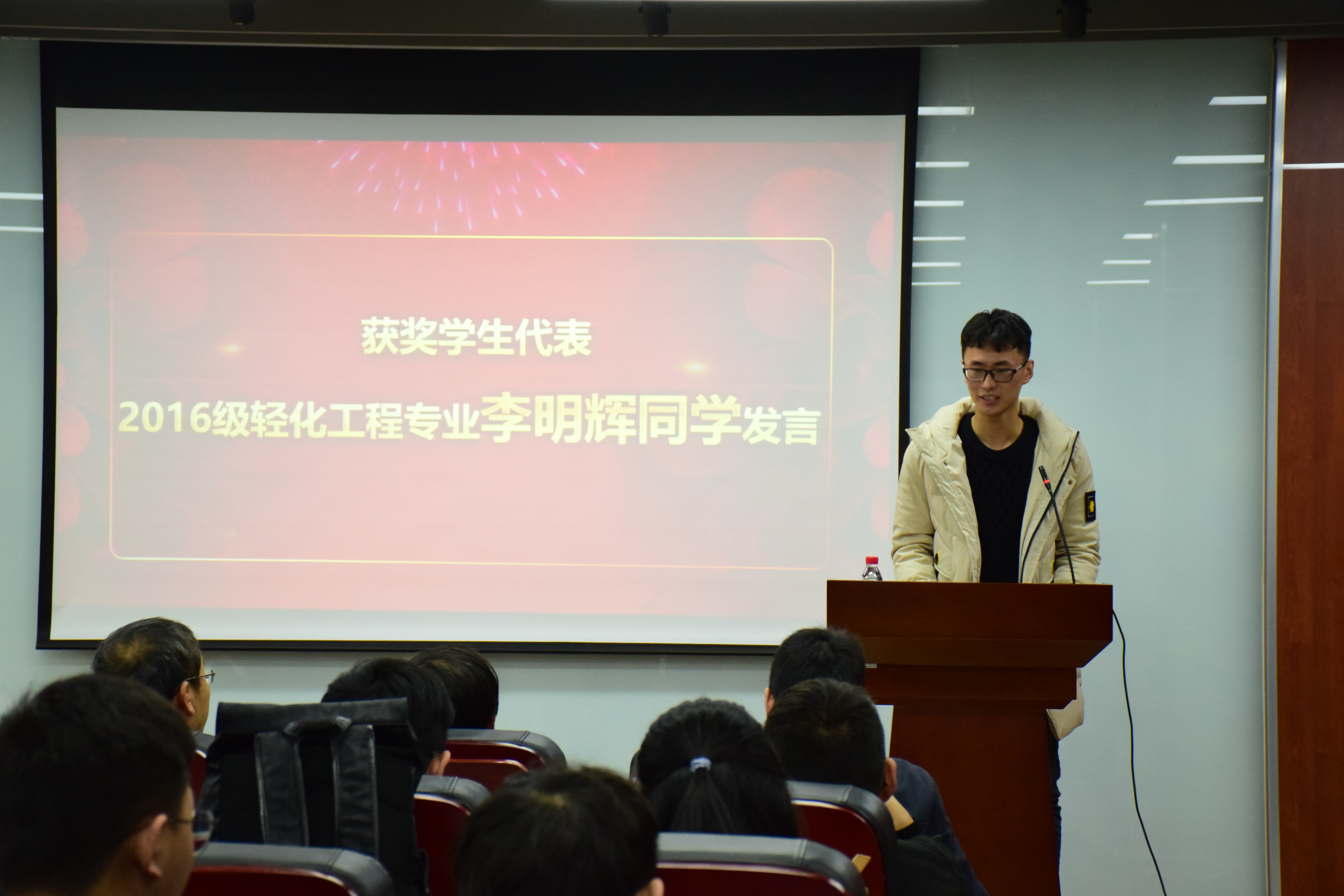 随后,威廉williamhill体育党委副书记冯国涛老师宣读了《关于表彰威廉williamhill体育生物质与皮革工程系2018年度优秀个人、优秀班级的决定》。在隆重的颁奖音乐中,学院领导及与会嘉宾为获奖同学一一颁奖并合影留念。最后,获奖学生代表,2016级轻化工程专业李明辉同学发言,表达了对设奖单位的感谢,对学院生物质与皮革工程系长期的培养与教育表示谢意,并表示一定以此为新的起点,继续努力,取得更优异的成绩回报行业、社会以及学校。