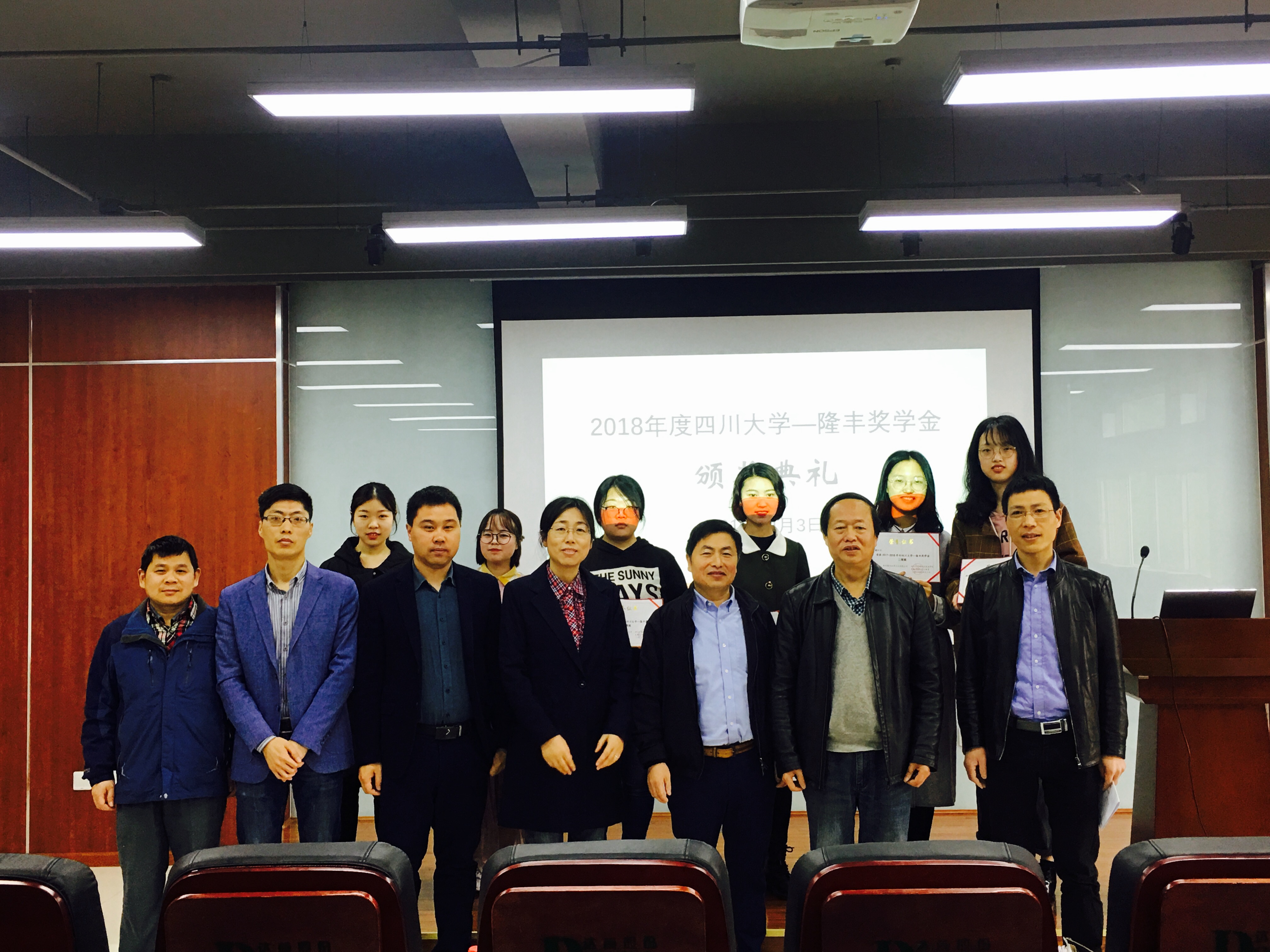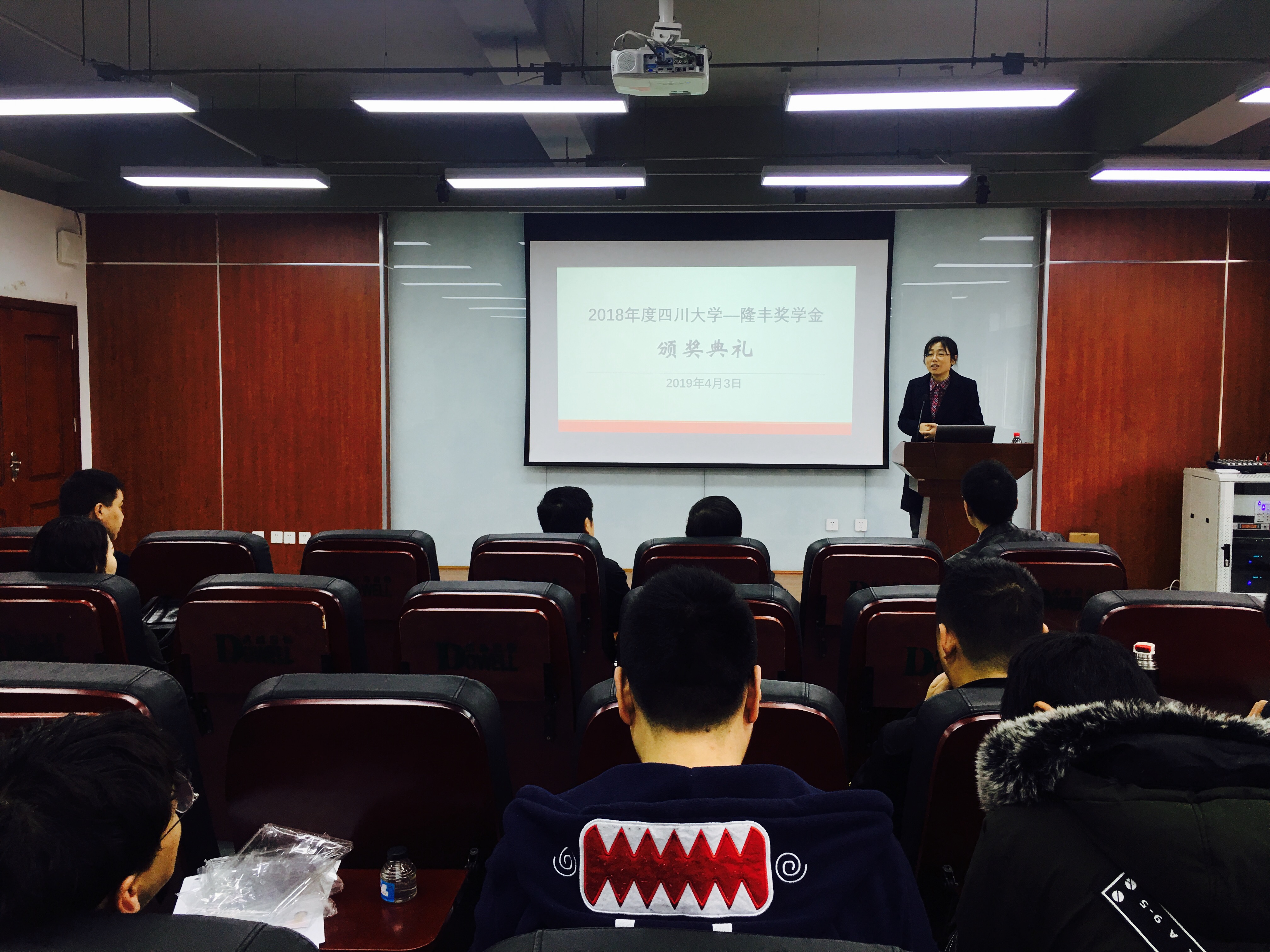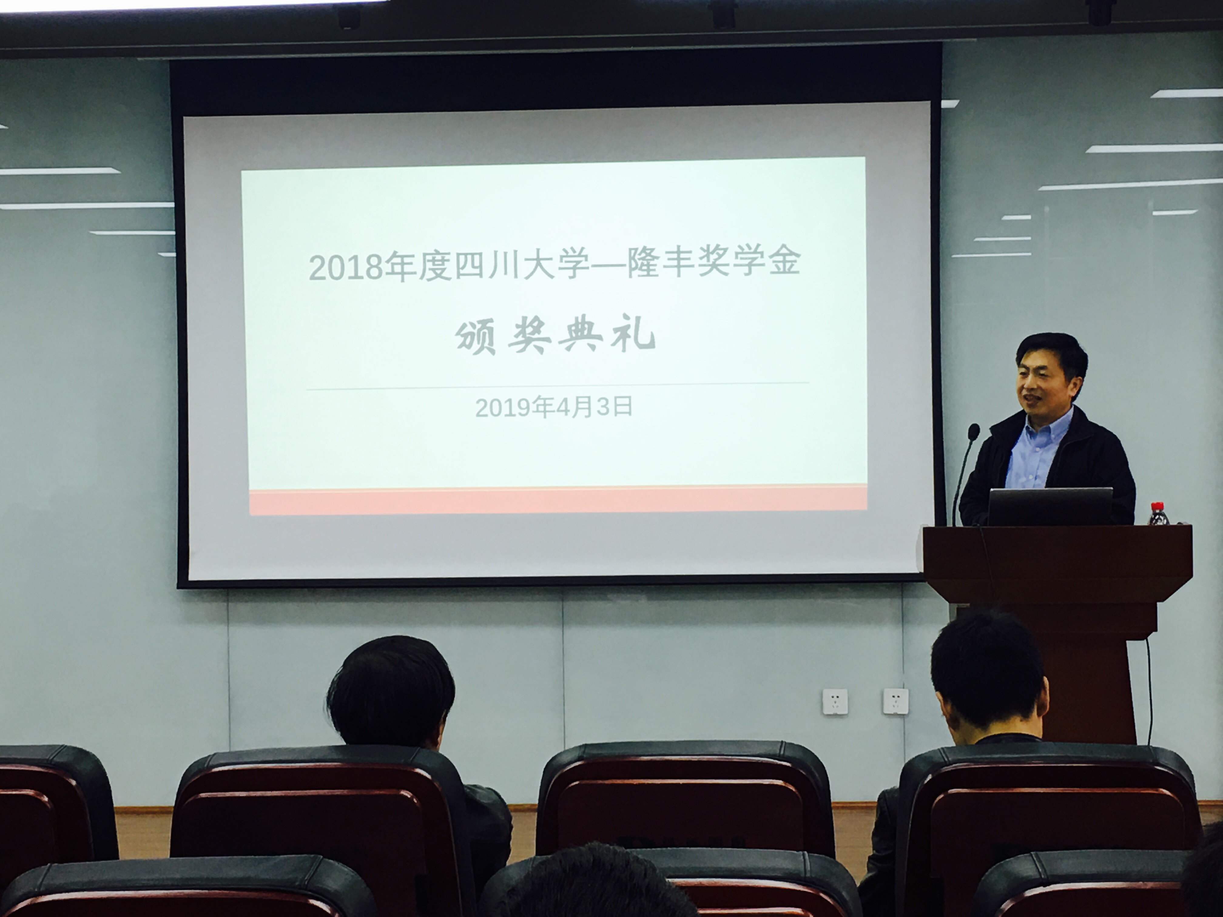 颁奖典礼开始后,林炜主任代表生物质与皮革工程系致辞。林主任首先对隆丰公司在我院设立奖学金表示感谢,对隆丰公司多年来对我院的人才培养、校友就业以及技术合作等方面的大力支持表示谢意,对通过自己努力,获得本次奖学金的同学表示衷心的祝贺;同时表达了行业的大量人才需求增强了学生的自信心与自豪感。紧接着隆丰皮草企业有限公司副总经理仲济德先生代表公司讲话,仲总讲述了从2009年开始与川大的全面合作,对川大学子在企业的优异变现表示赞赏。同时隆丰公司发展规模不断扩大、公司领域不断拓宽,尤其是在裘皮、制革、制鞋、污水处理以及国际合作等领域不断取得新的成绩,公司的进一步发展离不开人才、技术人员的支撑,因此公司也非常重视高校的专业人才培养,希望能通过奖学金的设立,让更多的学生了解隆丰、走进隆丰,与隆丰一起成长、发展。随后何有节院长宣读了获奖名单,并由到场的各位领导与嘉宾一起为第一届“四川大学—隆丰奖学金呢”获奖学生逐一颁奖。