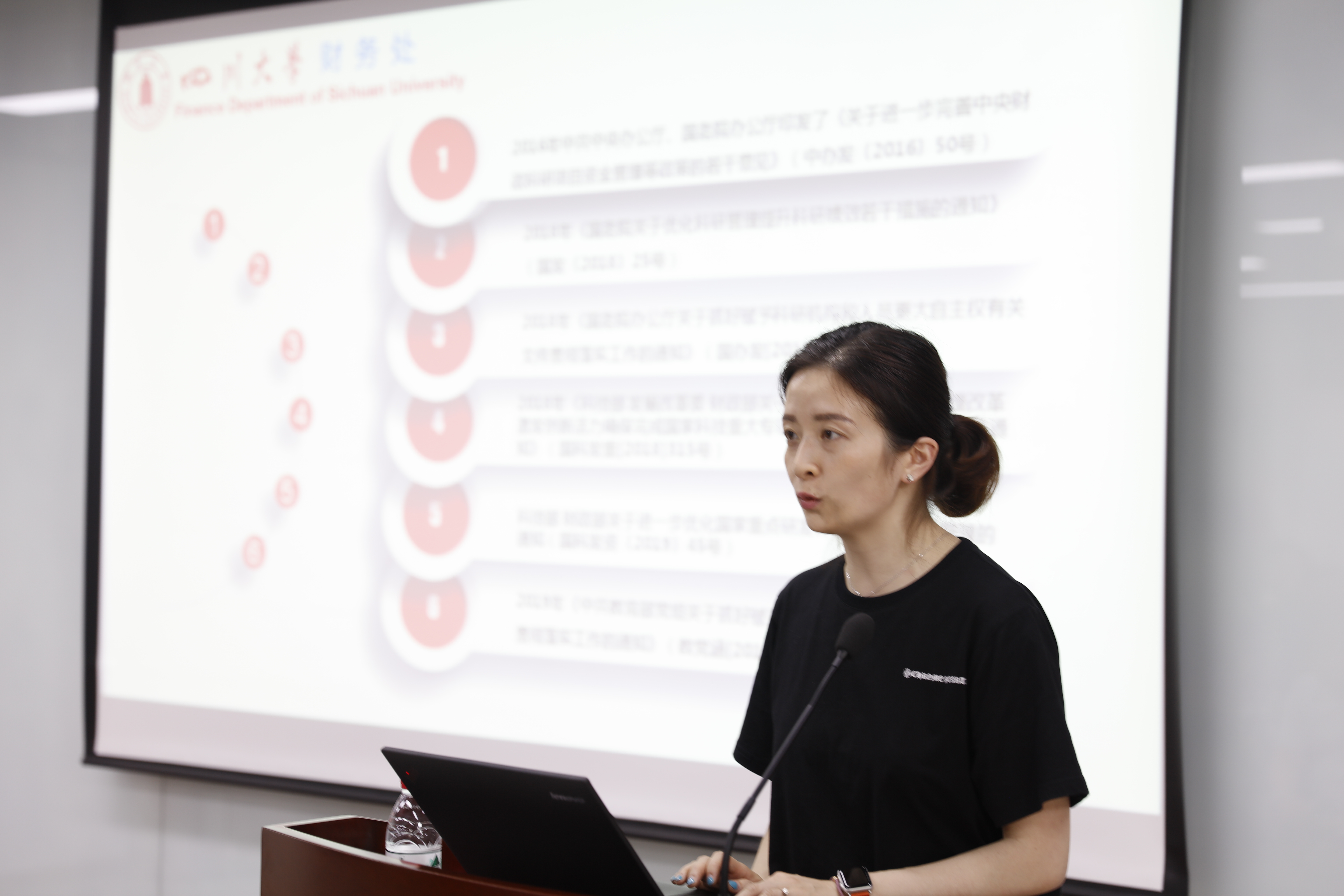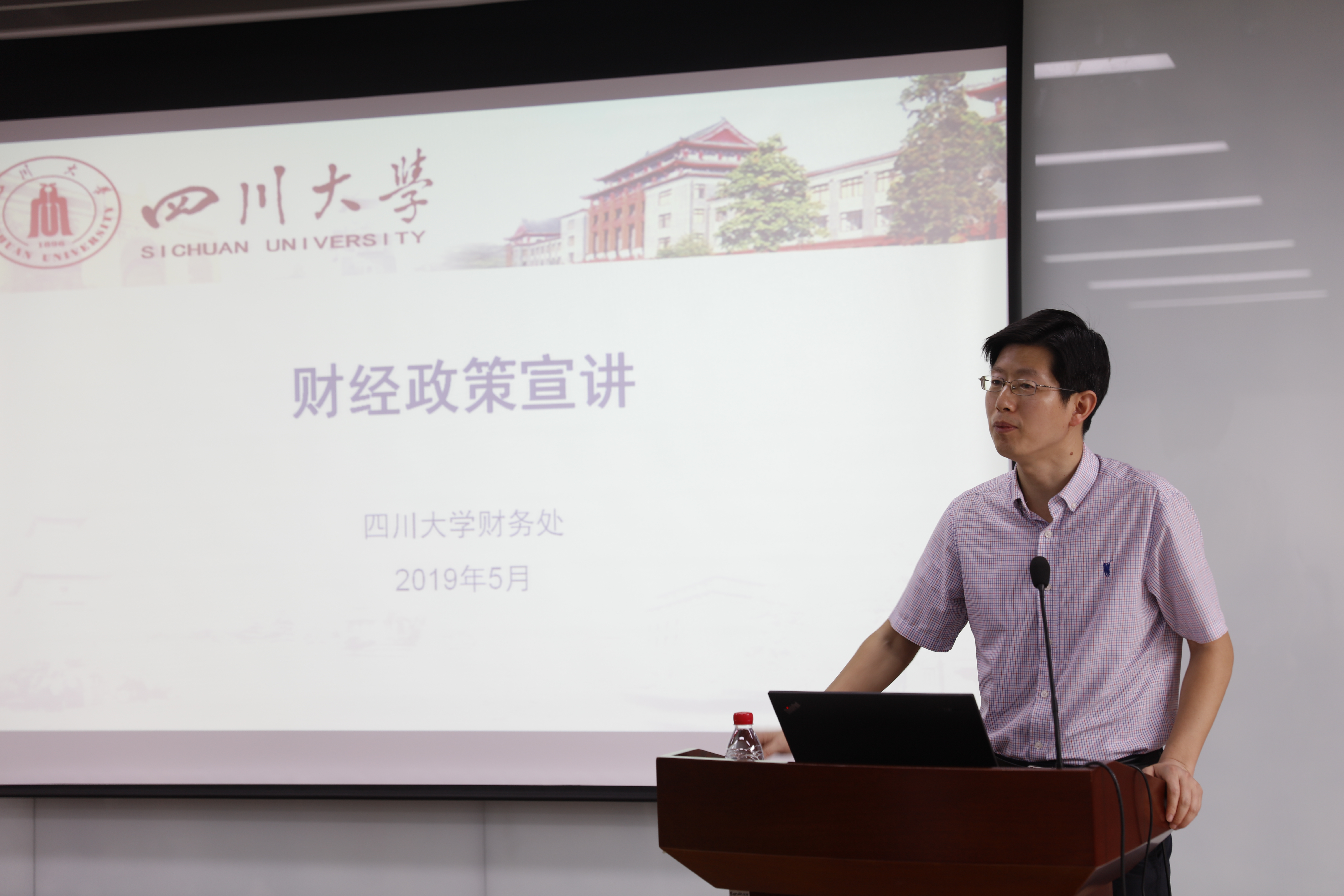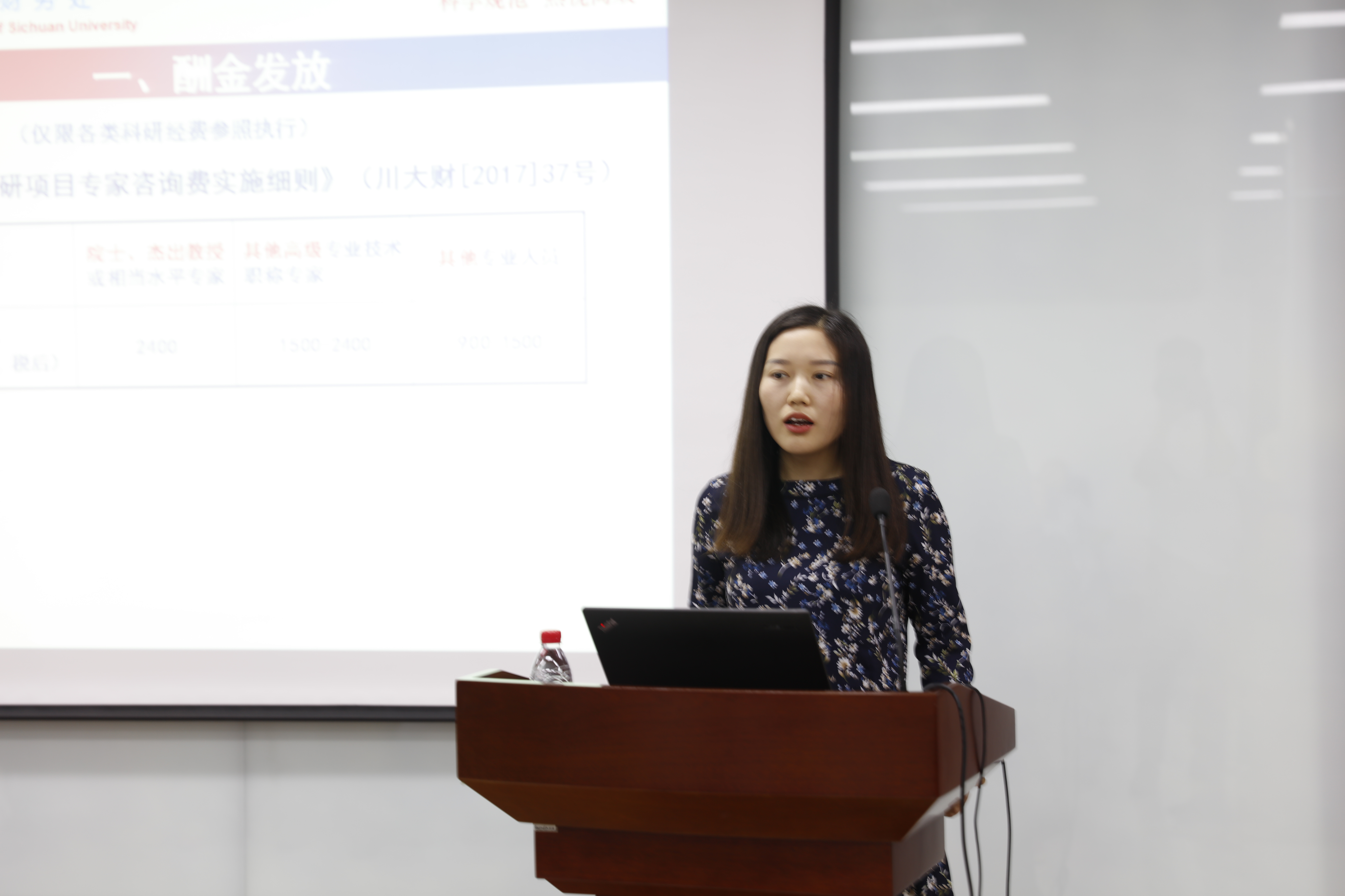 冯国涛副书记主持大会的第一项议程。学校财务处王春举副处长首先就校院两级管理体制改革中的财务管理制度改革向全院教职工作宣讲。吴思思、何明霞和张芹等三位老师分别就科研项目报账、个税政策、财务报销等教师普遍关心的内容,向全院教职工作政策解读。