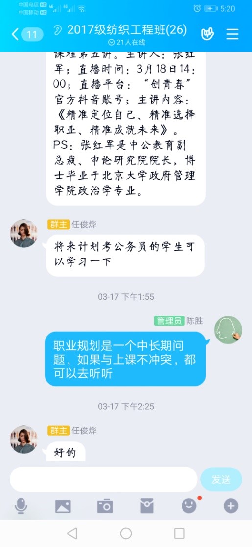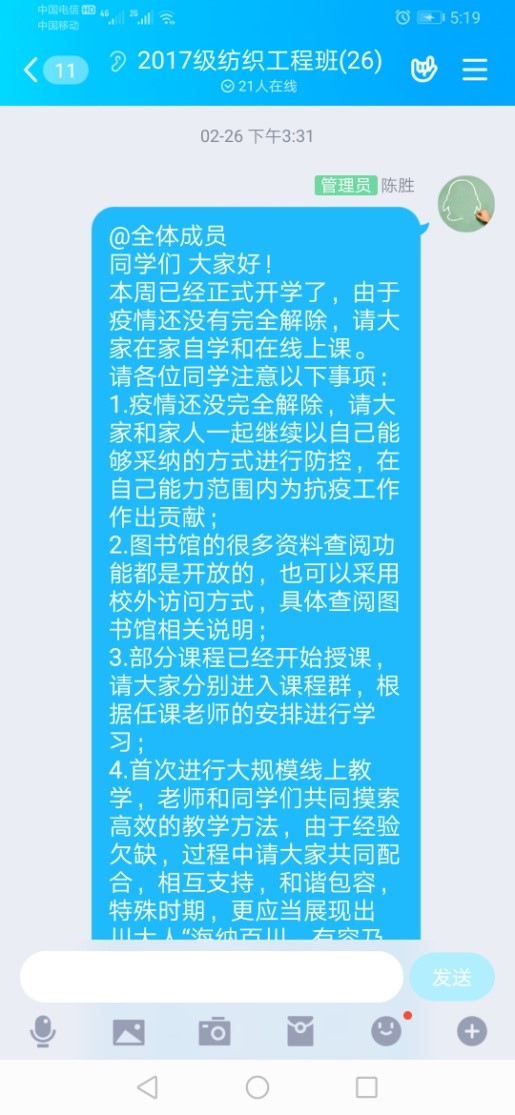 陈胜副教授担任研究生课程《纤维复合材料》线上教学工作,同时也是2017级纺织工程专业班主任。除了常规班主任工作,陈老师在开学后不断鼓励同学们应对好当前疫情的同时,明确目标,不负韶华。2月26号开学初,陈老师用牛顿的故事,鼓励大家在这段特殊的日子里,积极向上、勇往直前、不负青春;3月17日,针对学生职业规划定位,推荐适宜课程,提醒学生们提前规划,奋起发力未来。